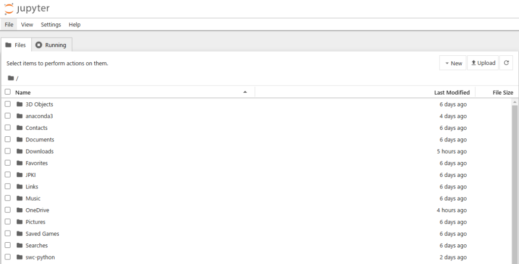 まず、Anacondaを開き、Jupyter Notebookを起動します。Anaconda Navigatorのメニューから「Jupyter Notebook」を選択すると、システムが読み込みを始め、しばらくするとブラウザが自動的に立ち上がります。この画面がJupyter Notebookのホーム画面です。