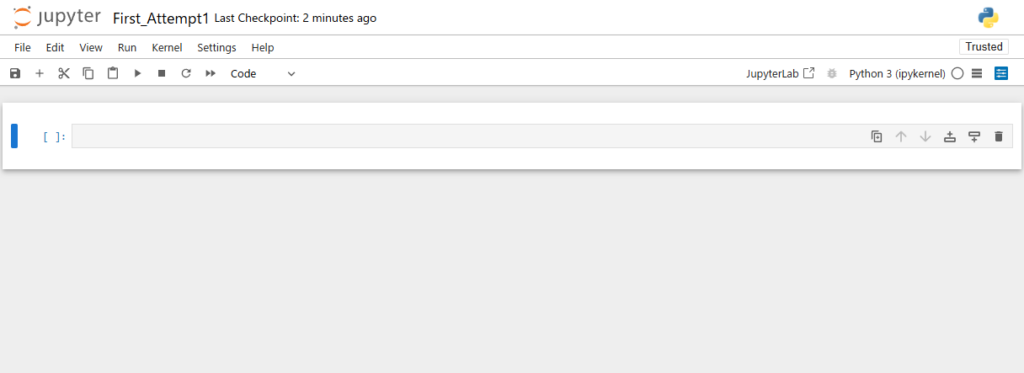 画面右上にある“File”メニューをクリックし、“New”を選択、さらに“Notebook”を選びます。すると、新しいタブに“Untitled.ipynb”というタイトルのノートブックが生成されます。このノートブックがPythonコードを実行するための作業スペースです。作業を整理するため、タイトルをクリックして名前を「First_Attempt1.ipynb」に変更しました。