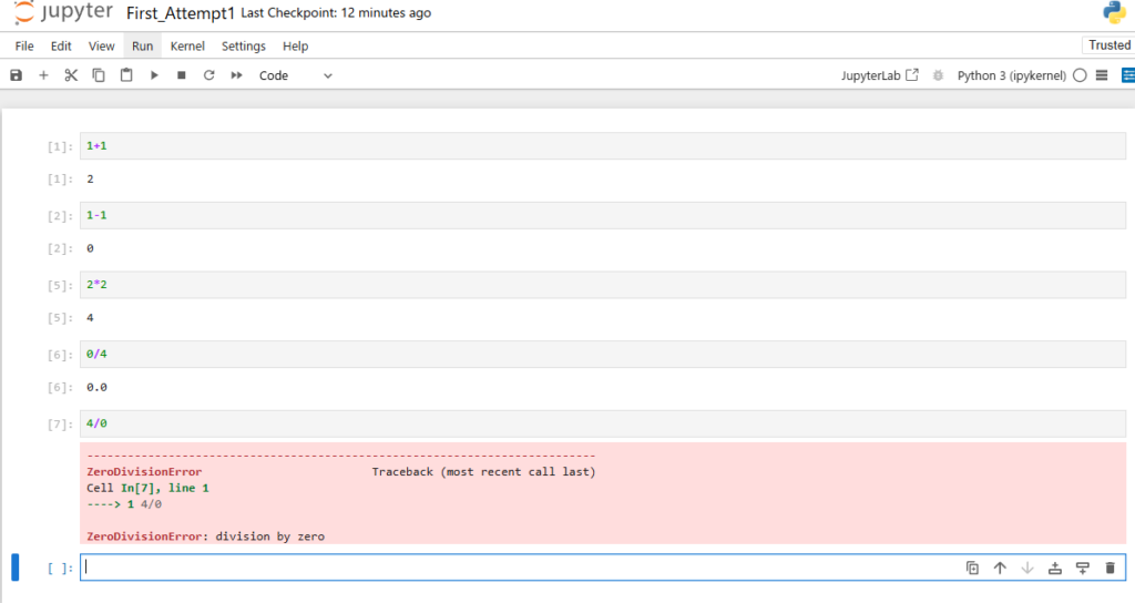 このコードを実行すると“Error”が表示されます。これはゼロで割り算をすることは数学的に許されないためです。Pythonはこのようなエラーを即座に教えてくれるので、初心者にも安心です。