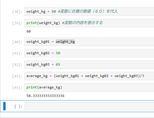 このコードを実行すると、3人の体重の平均値が表示されます。Pythonではシンプルな構文で計算が行えるため、計算の結果を即座に確認することができます。